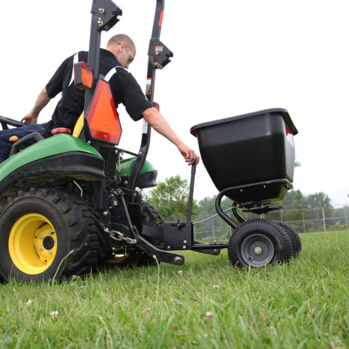 Need to spread larger yards? Brinly’s BS-36BH tow-behind broadcast spreader features a 3.5 cu. ft. hopper, ideal for homeowners and light commercial applications of 1 acre and larger. The universal hitch fits most lawn tractors so you don’t have to do the heavy work. Use it year-round to easily apply seed, fertilizer, and other lawn chemicals. In winter, use your broadcast spreader to apply salt, sand, & other snow and ice melt agents. So no matter the season – spring, summer, fall or winter – This Spreader has you and your property covered.